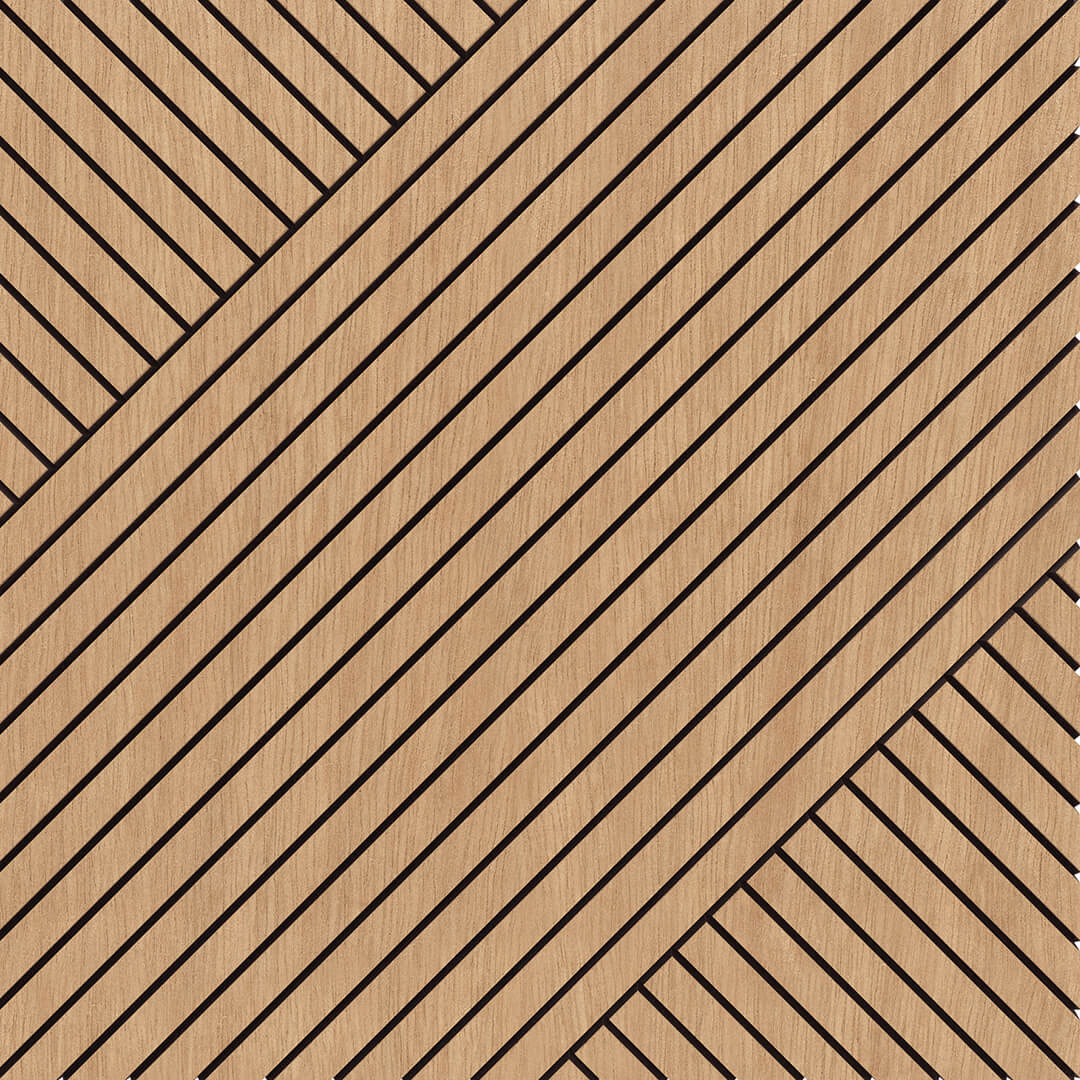 Painel decorativo de madeira com padrão geométrico de linhas diagonais.