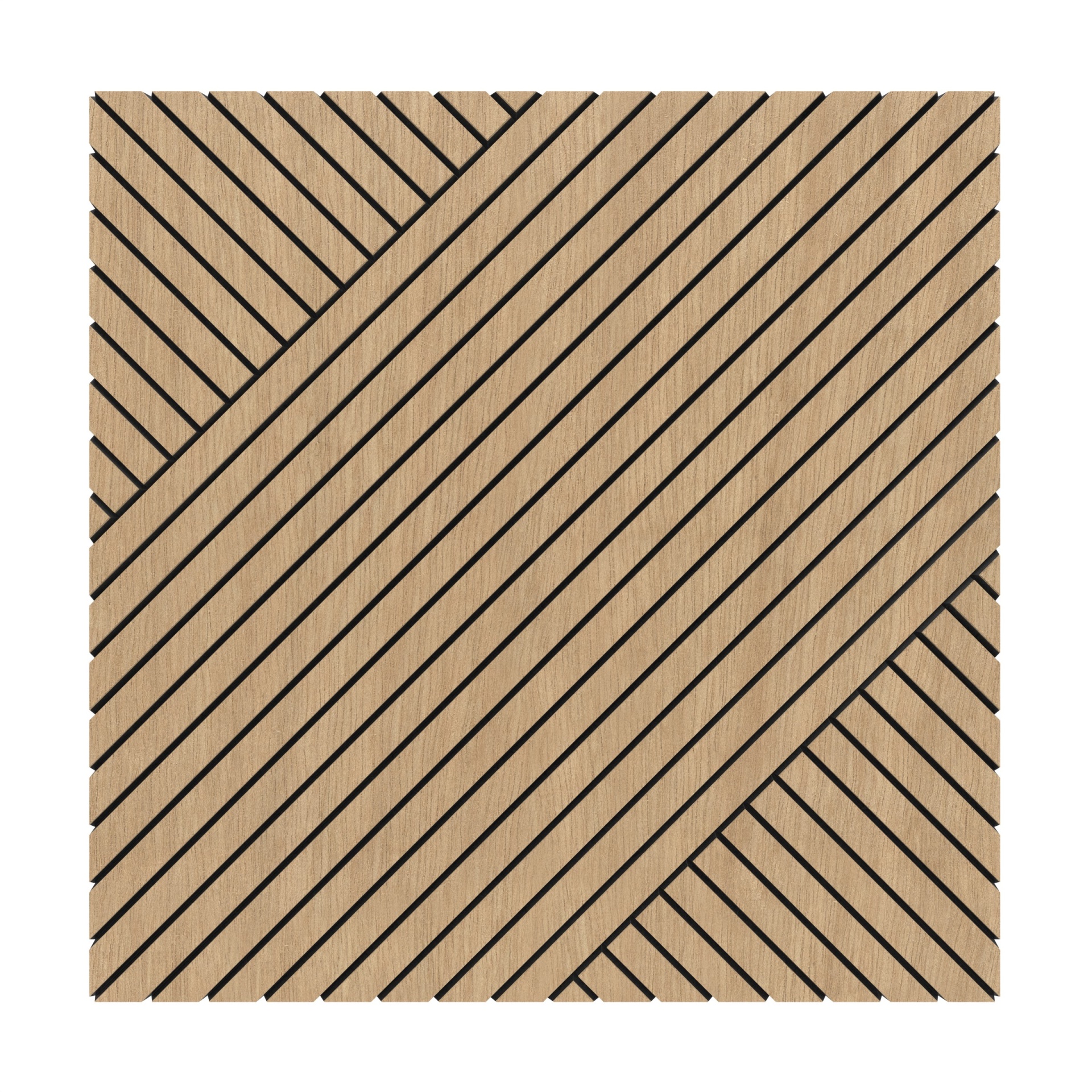 Placa quadrada de madeira clara com padrão geométrico de linhas diagonais pretas
