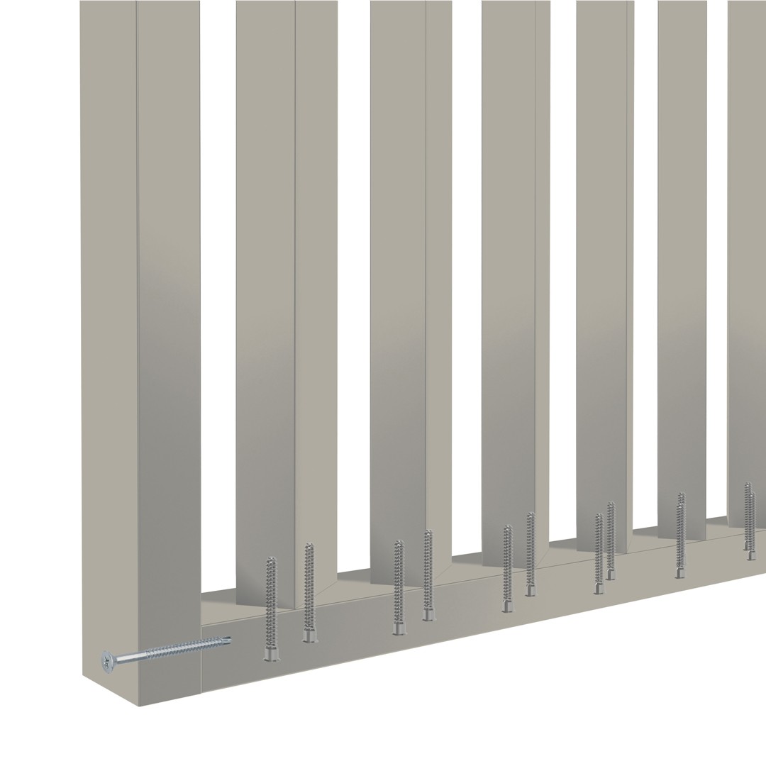 Guarda-corpo metálico cinza claro com barras verticais retangulares espessas
