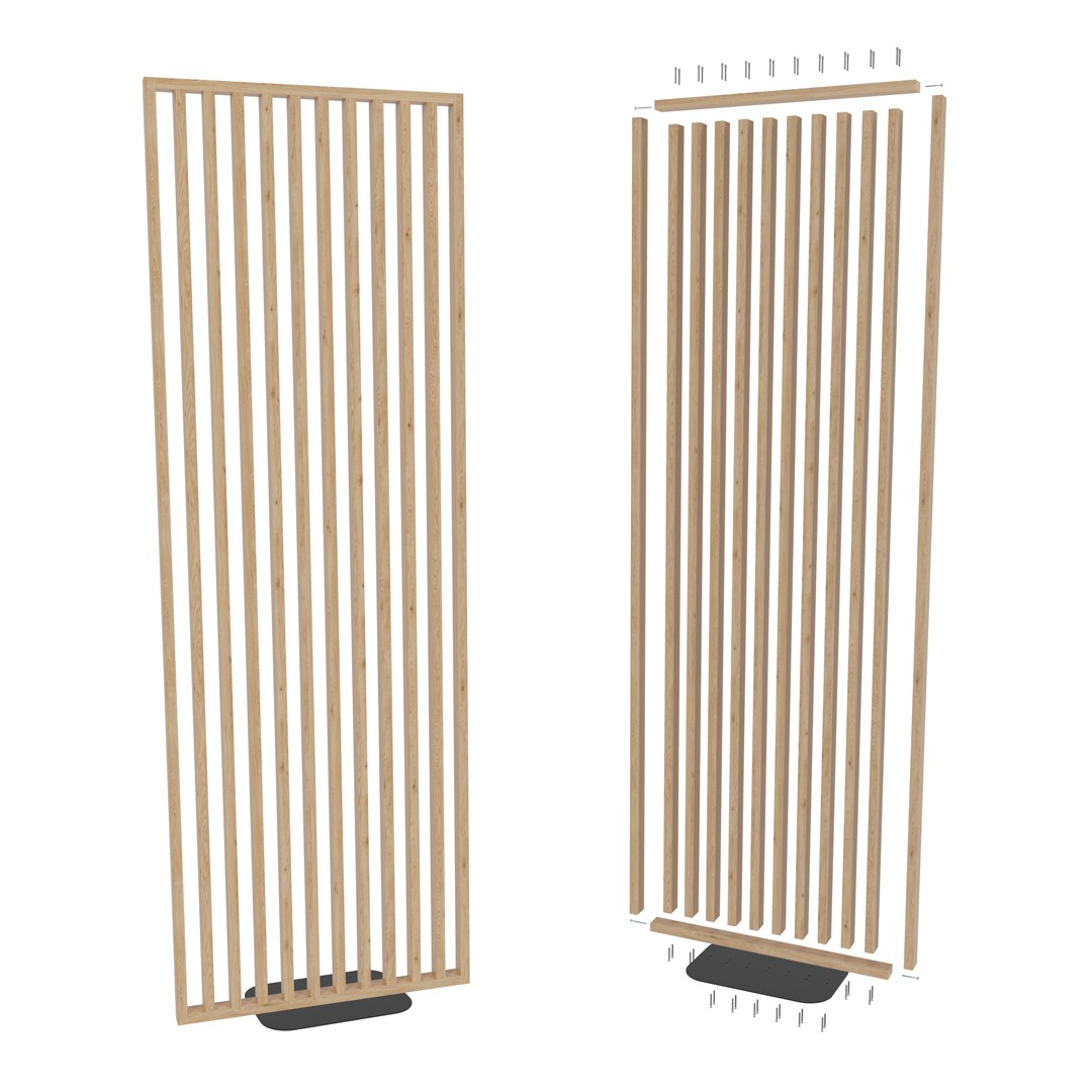 Divisória de ambiente em madeira clara com ripas verticais e base preta
