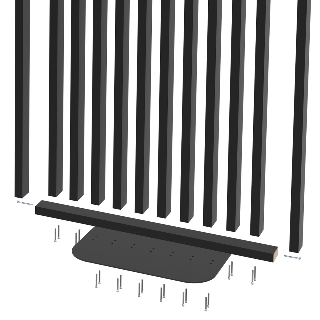 Ripado de madeira preta com parafusos prateados sobre fundo branco
