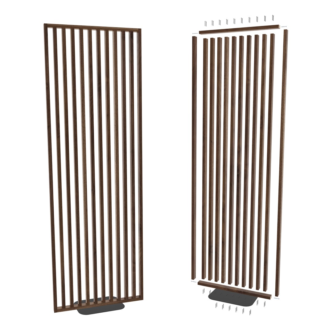 Biombo em madeira castanho escuro com 10 ripas verticais e base preta