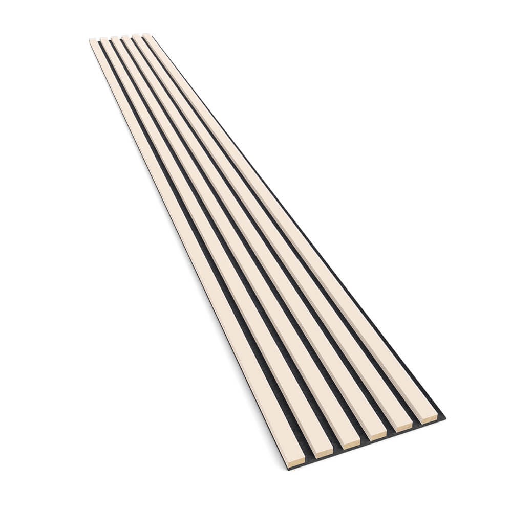 Painel de parede decorativo com lâminas verticais em madeira clara e espaços pretos